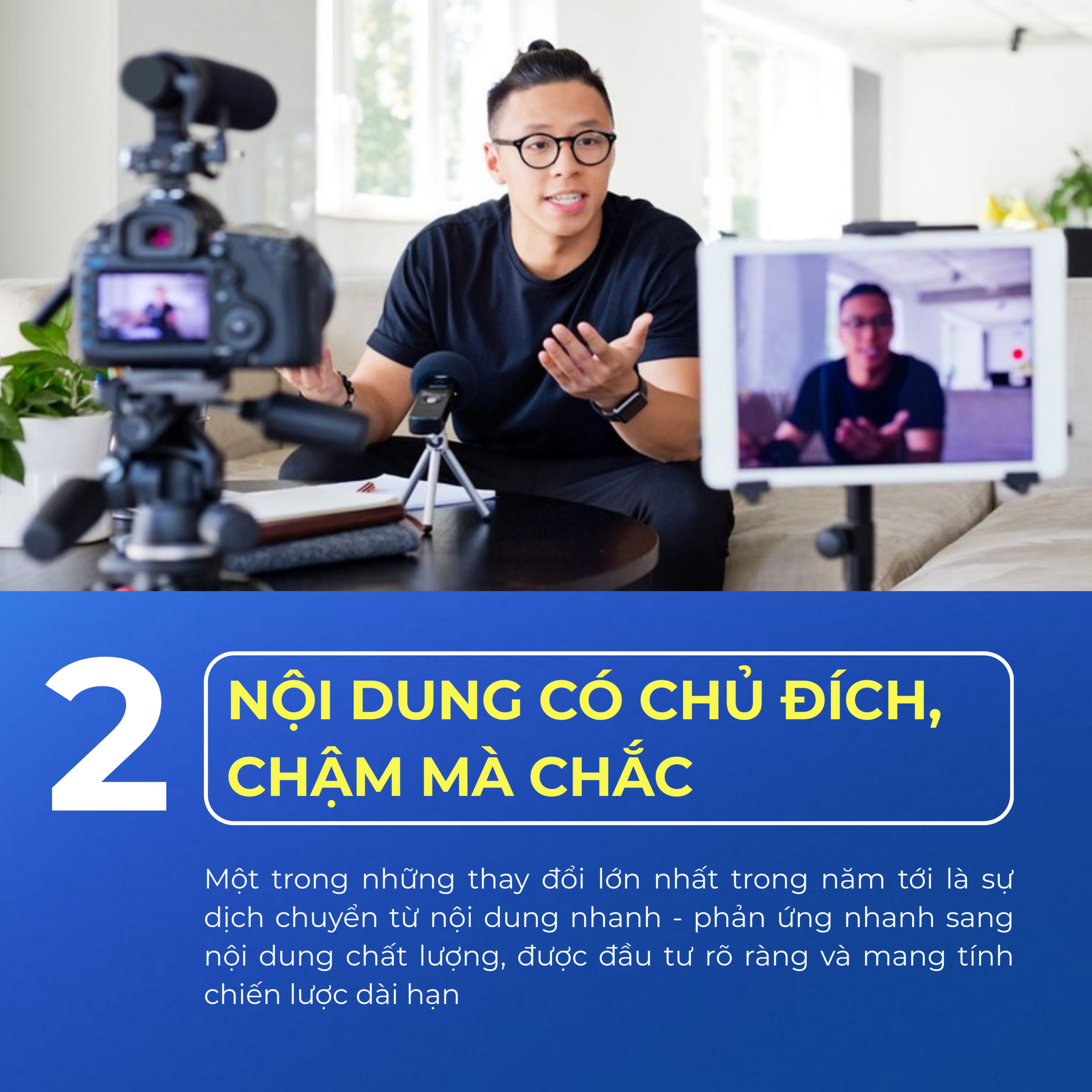 Năm 2026 đánh dấu sự thoái trào của những nội dung “mì ăn liền” chỉ nhằm mục đích câu tương tác nhất thời. Thay vào đó là sự lên ngôi của chiến lược nội dung chất lượng cao. Các chiến dịch sẽ chuyển dịch từ nội dung nhanh sang nội dung có chiều sâu, được đầu tư kỹ lưỡng về chất xám và mang tính chiến lược dài hạn. Video ngắn vẫn thống trị nhưng các “mini-docs” (phim tài liệu ngắn), podcast hoặc các series dài tập trên Threads và YouTube sẽ trở thành cầu nối giúp khách hàng hiểu sâu về giá trị thương hiệu. Mỗi bài đăng của Influencer cần trả lời được câu hỏi: Nội dung này giúp ích gì cho cuộc sống của người xem? thay vì chỉ đơn thuần là một bài quảng cáo.